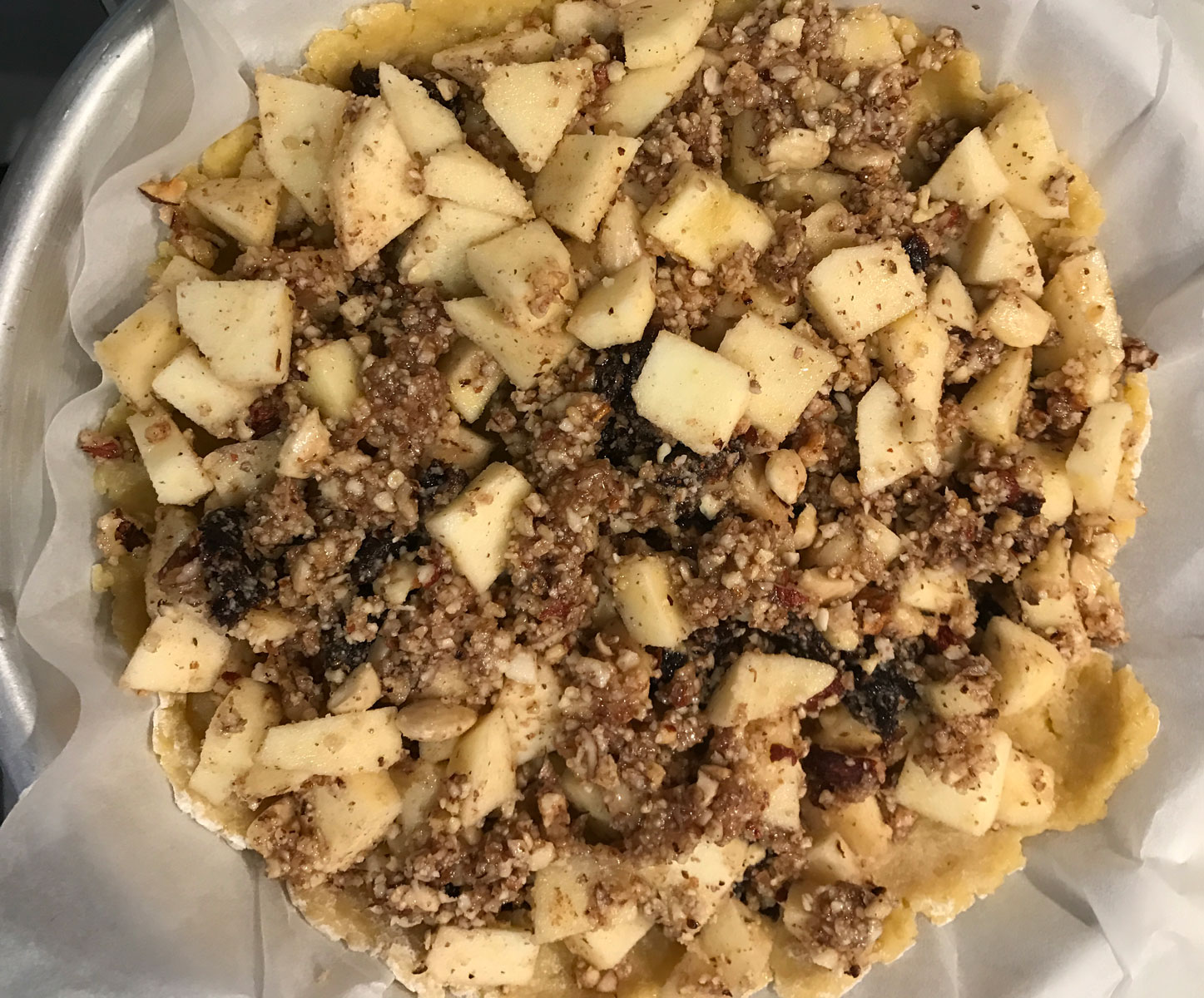 Per comporre l’apple pie: dividi la frolla in due, di cui una parte un pò più grande dell’altra. Stendi l’impasto maggiore su un foglio di carta forno e mettilo all’interno di una teglia di 25 cm di diametro. Bucherella il fondo con una forchetta e versaci dentro il ripieno.