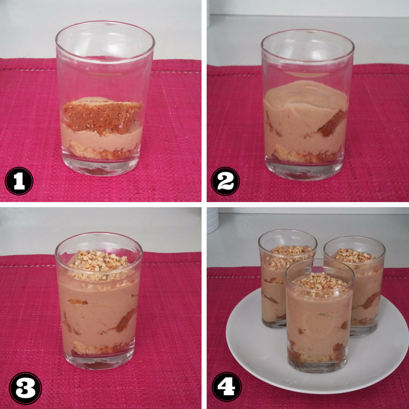 Taglia il ciambellone a fettine, metti una fettina sul fondo del bicchiere, bagnalo con un po’ di bagna al caffè e copri con la crema (1); aggiungi un’ altra fettina di ciambellone, bagnalo e ricoprilo con altra crema (2). Continua così fino a riempire tutto il bicchierino (3). Termina con la crema e cospargi con granella di nocciole (4) (se non ce l’hai va bene anche cacao amaro). Metti in frigo qualche ora prima di servire (nel mio caso i bicchierini sono stati in frigo solo 1 h, il tempo della cena, ma gli ospiti hanno apprezzato molto!)