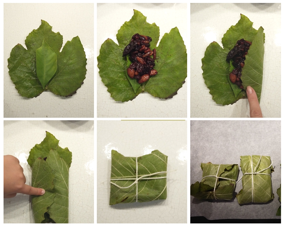 Componi i fagottini: lava le foglie di limone e fico e asciugale con la carta assorbente. Metti la foglia di limone su quella di fico, poi un po’ di composto sulla foglia di limone e arrotola con la foglia di fico per formare dei fagottini. Chiudi i fagottini con lo spago da cucina e metti in forno.