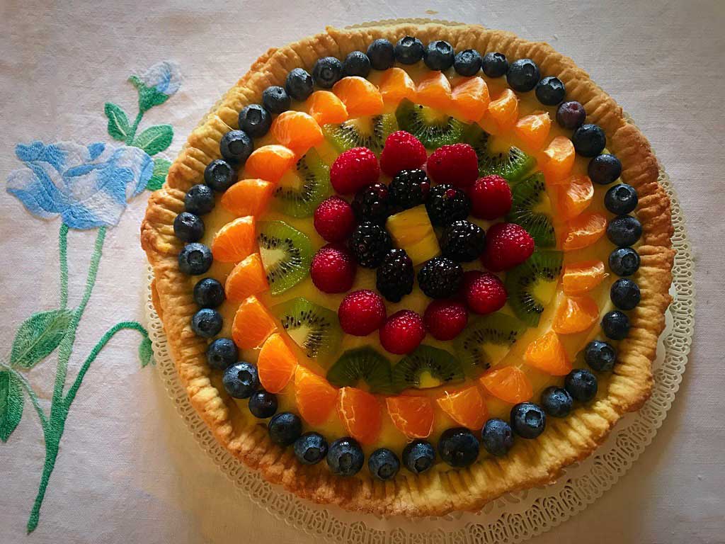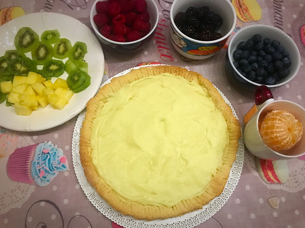Quando la frolla si è raffreddata versa la crema (fredda) e guarnisci con frutta fresca.