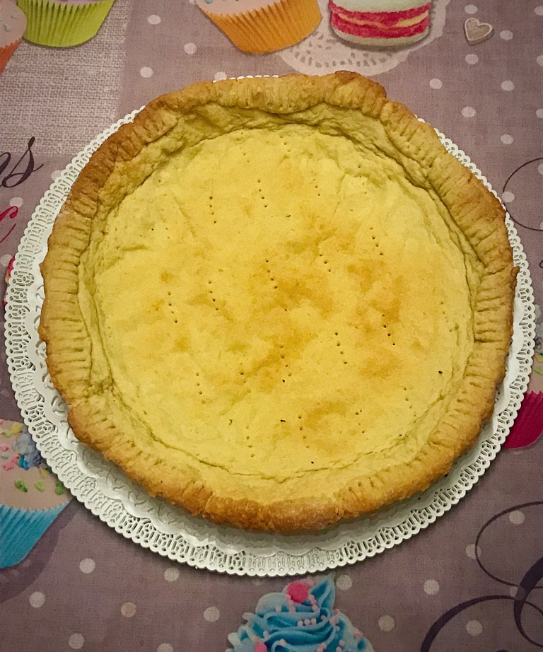 Trascorso il tempo di riposo, prendi la frolla e stendila su un foglio di carta forno. Adagia la base su una tortiera e bucherellala con una forchetta. Aggiungi sulla frolla un foglio di carta forno e delle pietre (o dei fagioli) per non far gonfiare la frolla in cottura.