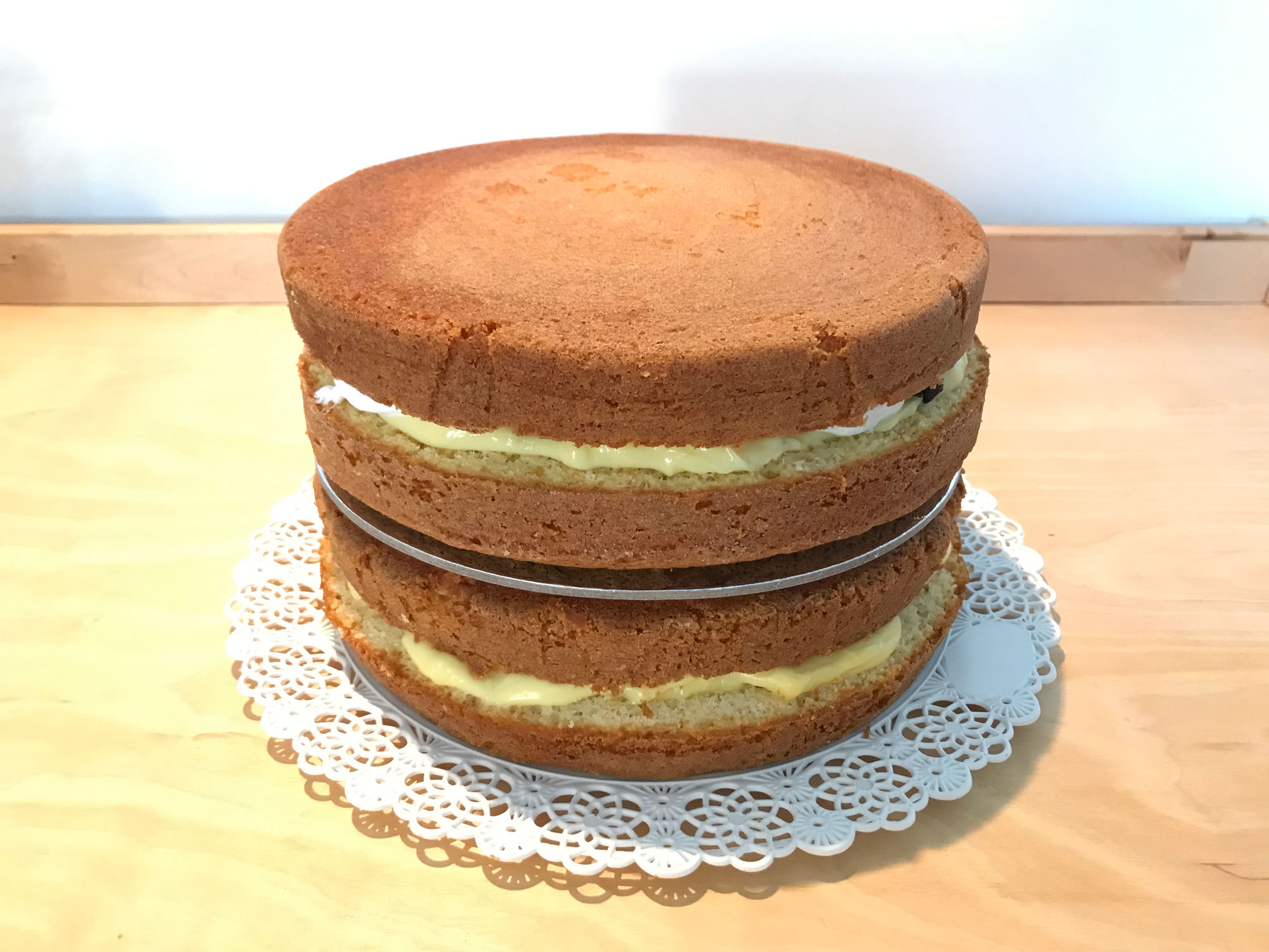 Ripeti il procedimento di bagna e farcitura con il secondo pan di spagna.