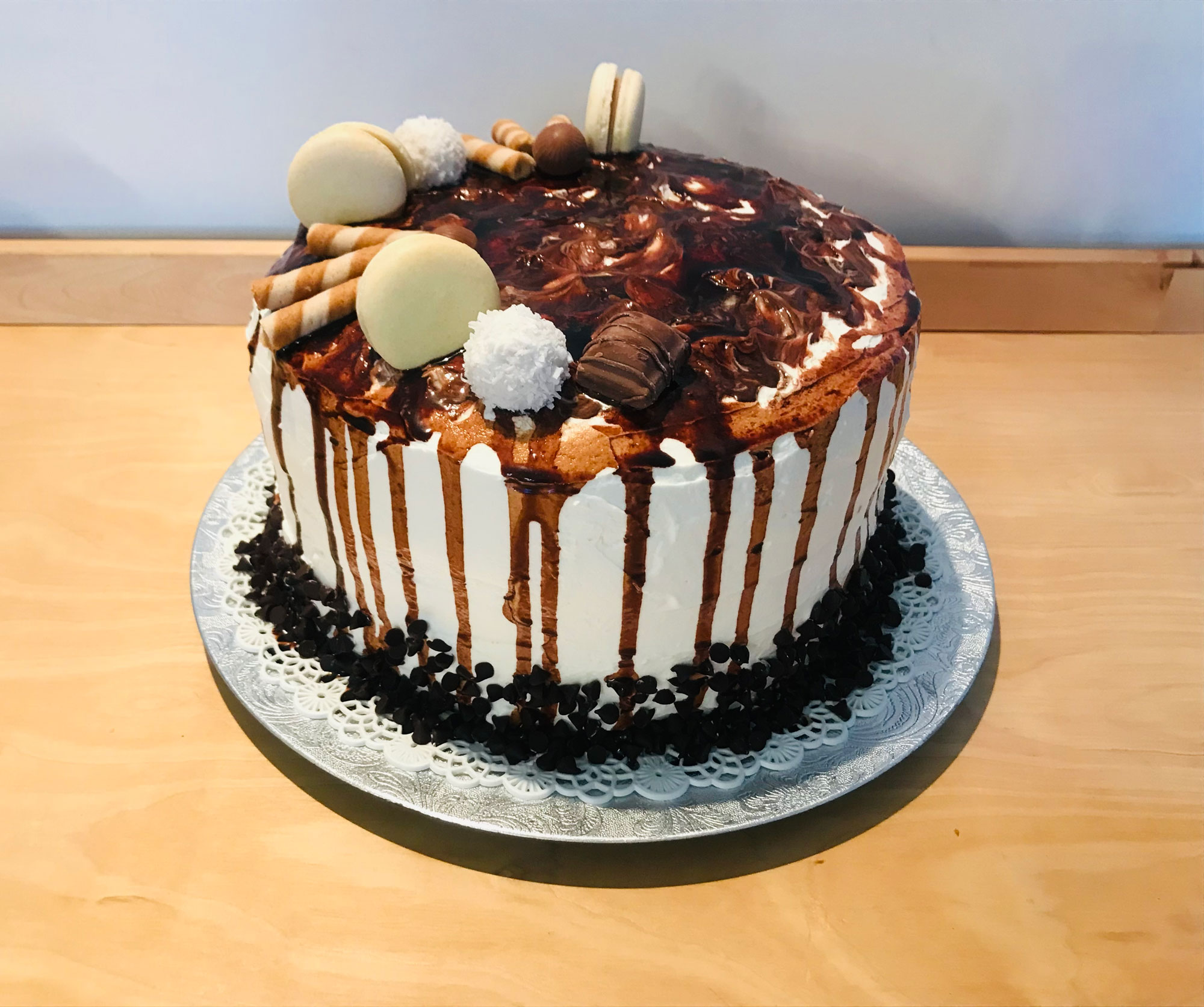 La drip cake è una torta molto scenografica! Una torta alta, a strati, arricchita da una copertura deliziosa di cioccolato che cade verso il basso creando una bellissima decorazione a cui si aggiungono cioccolatini, biscotti, praline, bon bon, macaron…tutte le delizie che preferisci!