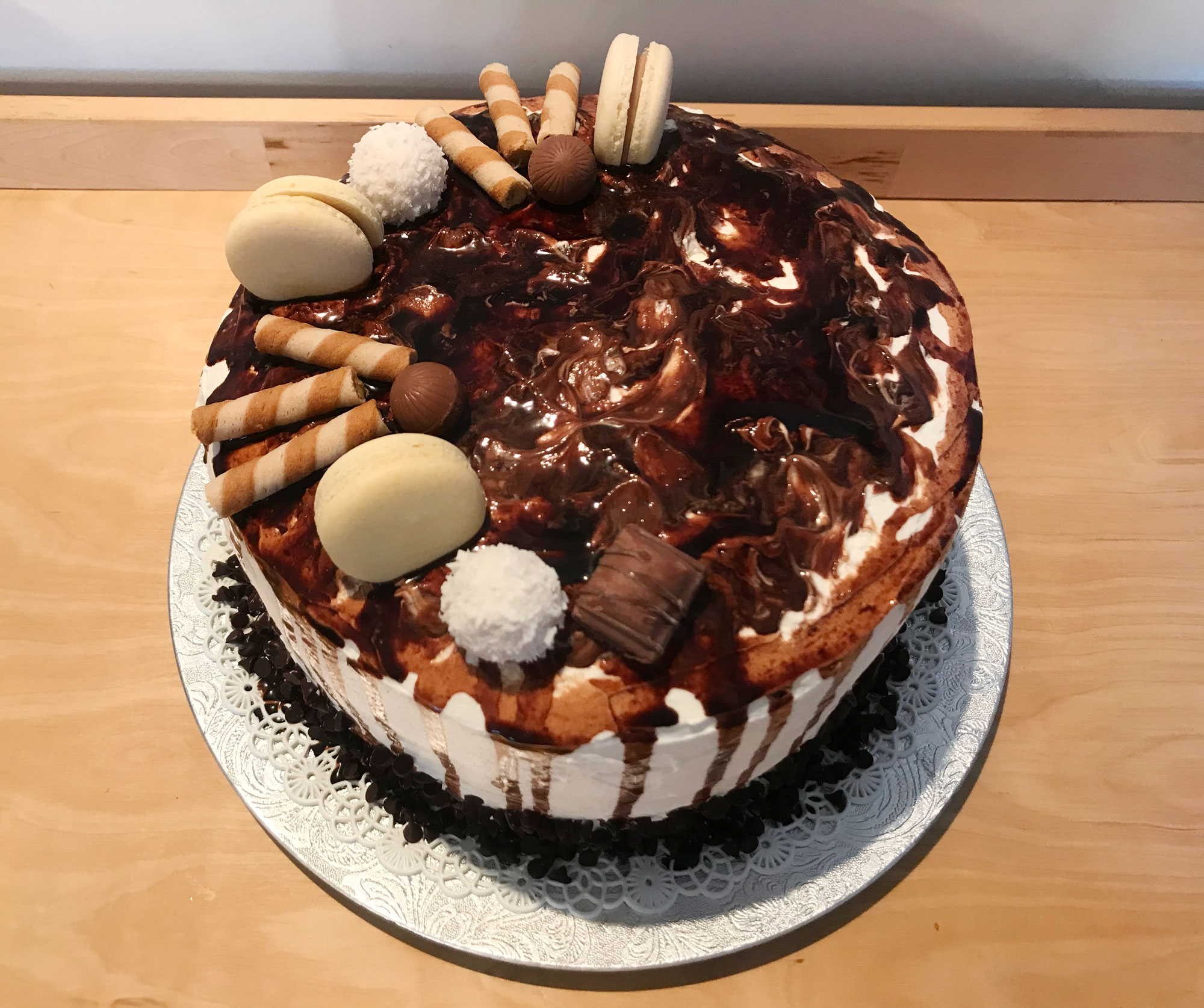 Aggiungi le decorazioni che preferisci (biscotti, cioccolatini, bon bon, granella di nocciole…), et voilà, la tua drip cake è pronta!Spettacolare, no!?