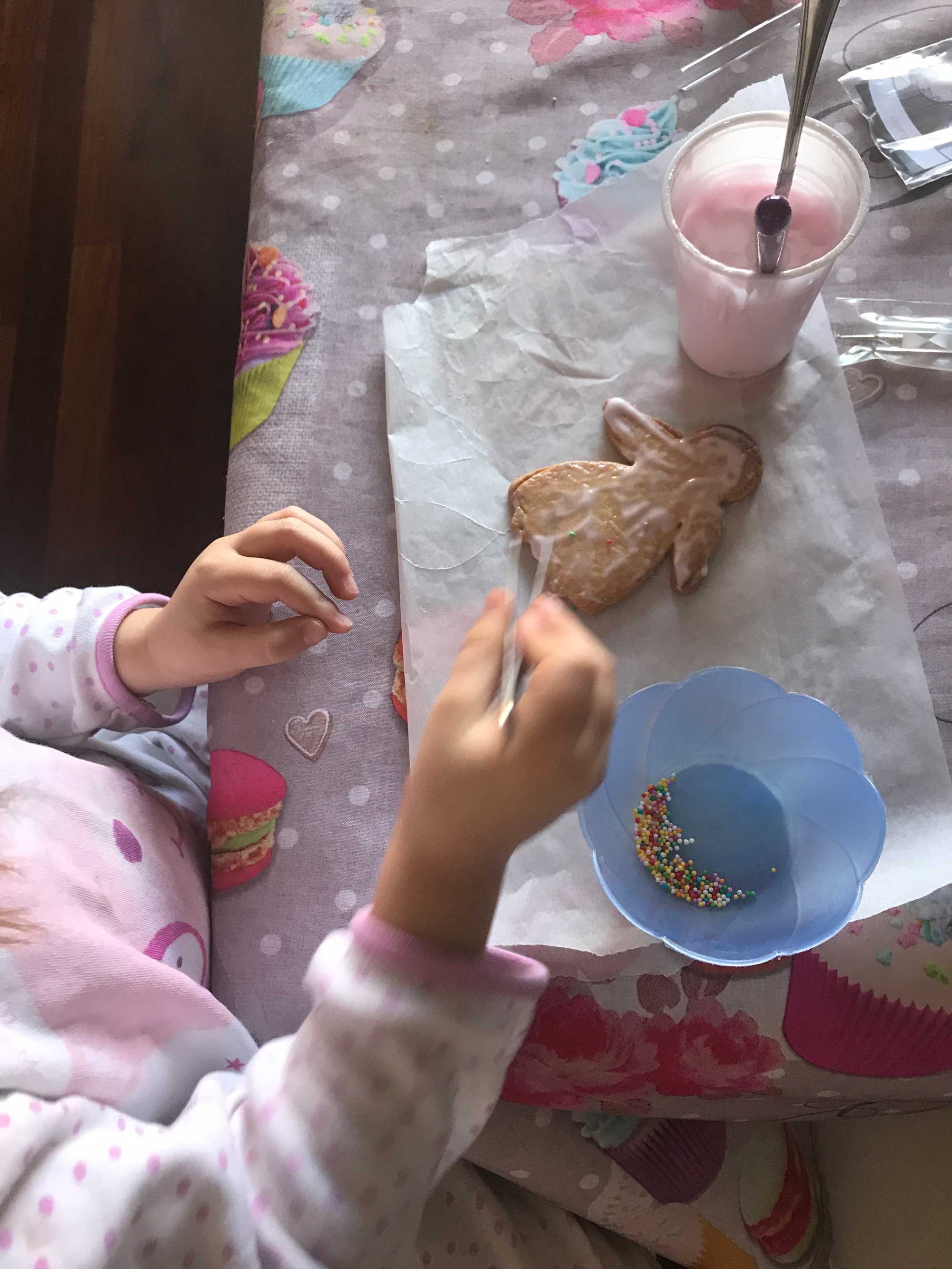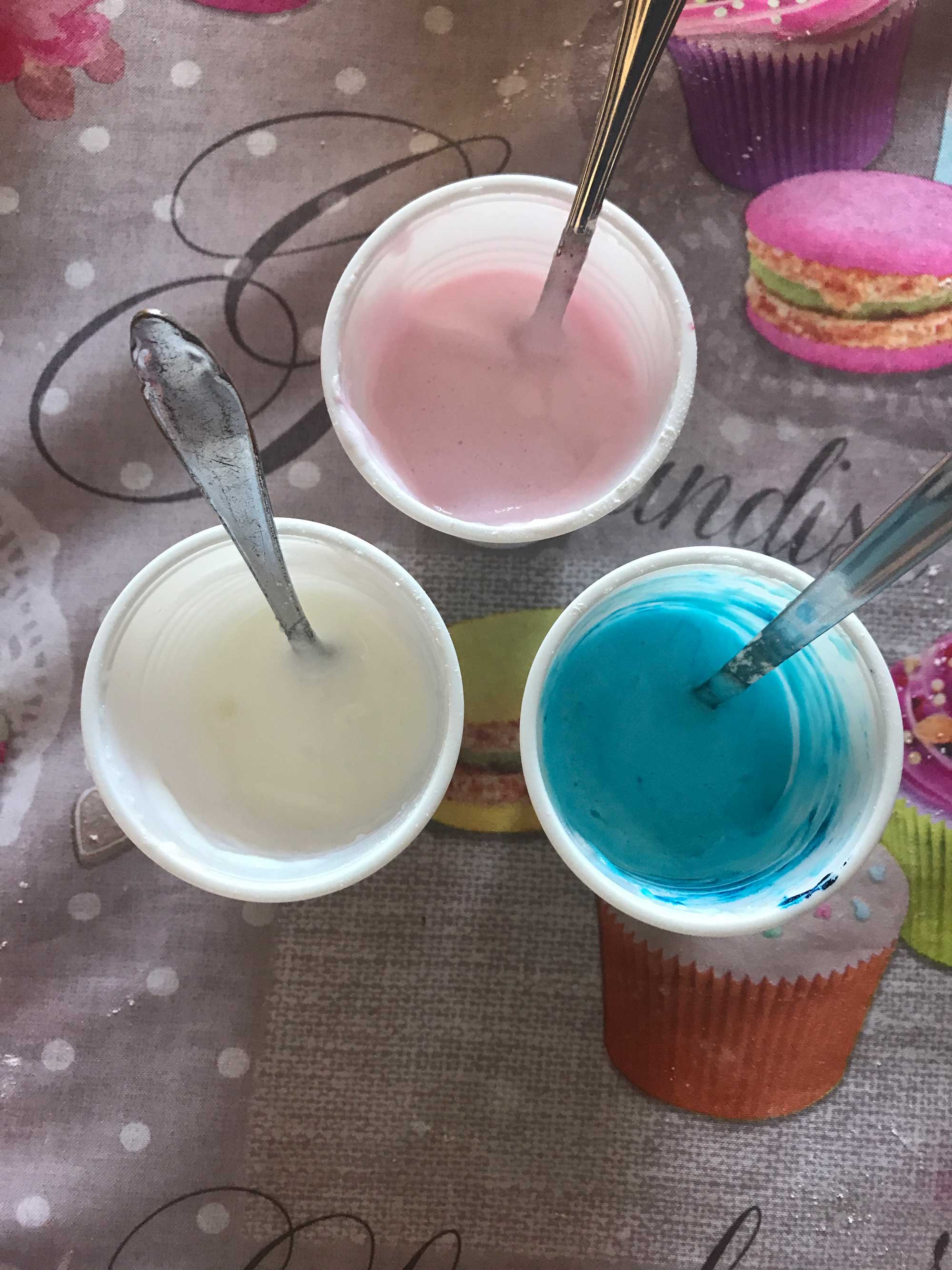 Se non vuoi usare la glassa già pronta, mettiti all’opera! Monta a neve 2 albumi con qualche goccia di limone. Dividi gli albumi montati in 3 bicchieri di carta e in ognuno aggiungi qualche goccia di colorante alimentare e tanto zucchero a velo quanto basta per creare una glassa consistente ma morbida (sbatti energicamente con una forchetta quando aggiungi lo zucchero). Io ho preparato una glassa bianca, una rosa e una azzurra.