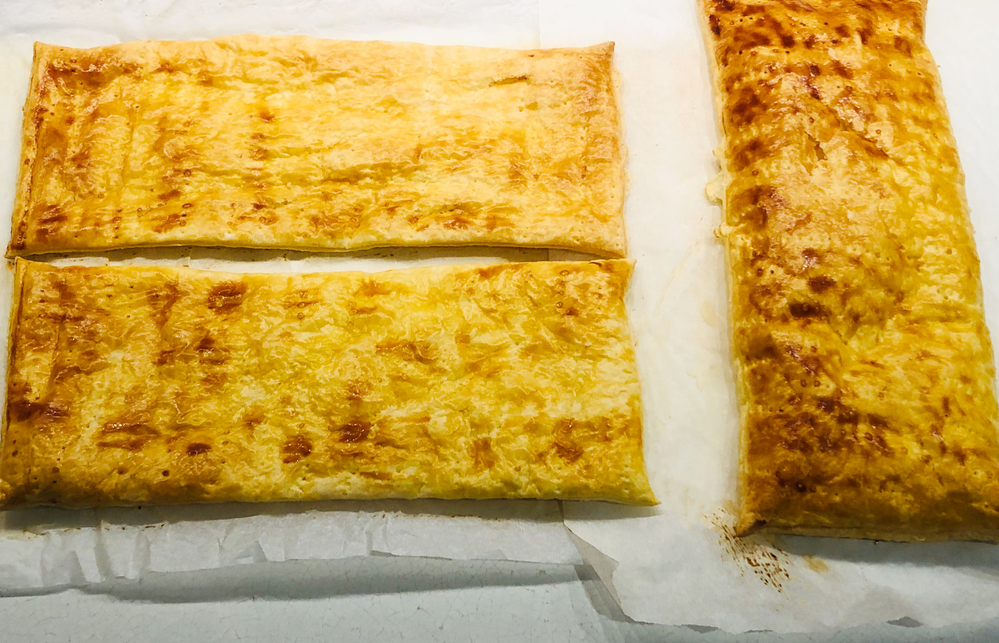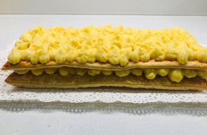 Copri con un altro rettangolo di sfoglia, aggiungi altra crema pasticcera e termina con un altro rettangolo di pasta sfoglia.