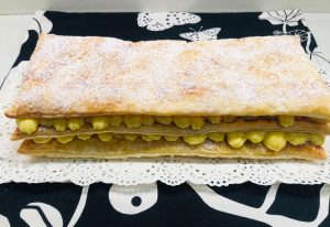 La millefoglie è uno dei miei dolci preferiti! E’ composta da strati di pasta sfoglia croccante e crema pasticcera; la puoi decorare con quello che più ti aggrada. Io ho utilizzato lamponi e zucchero a velo, ma puoi optare per del cioccolato, o granella di pistacchio o panna montata. La ricetta, utilizzando pasta sfoglia già pronta, è semplicissima e veloce da preparare!