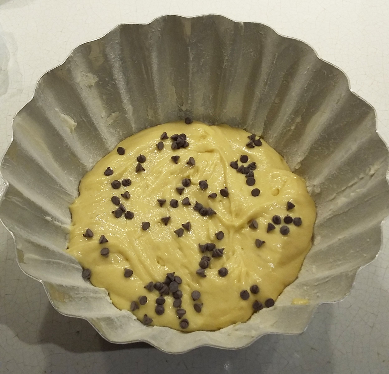 Versa metà composto in una teglia imburrata e infarinata, aggiungi le gocce di cioccolato e copri con il restante composto. Cuoci in forno.