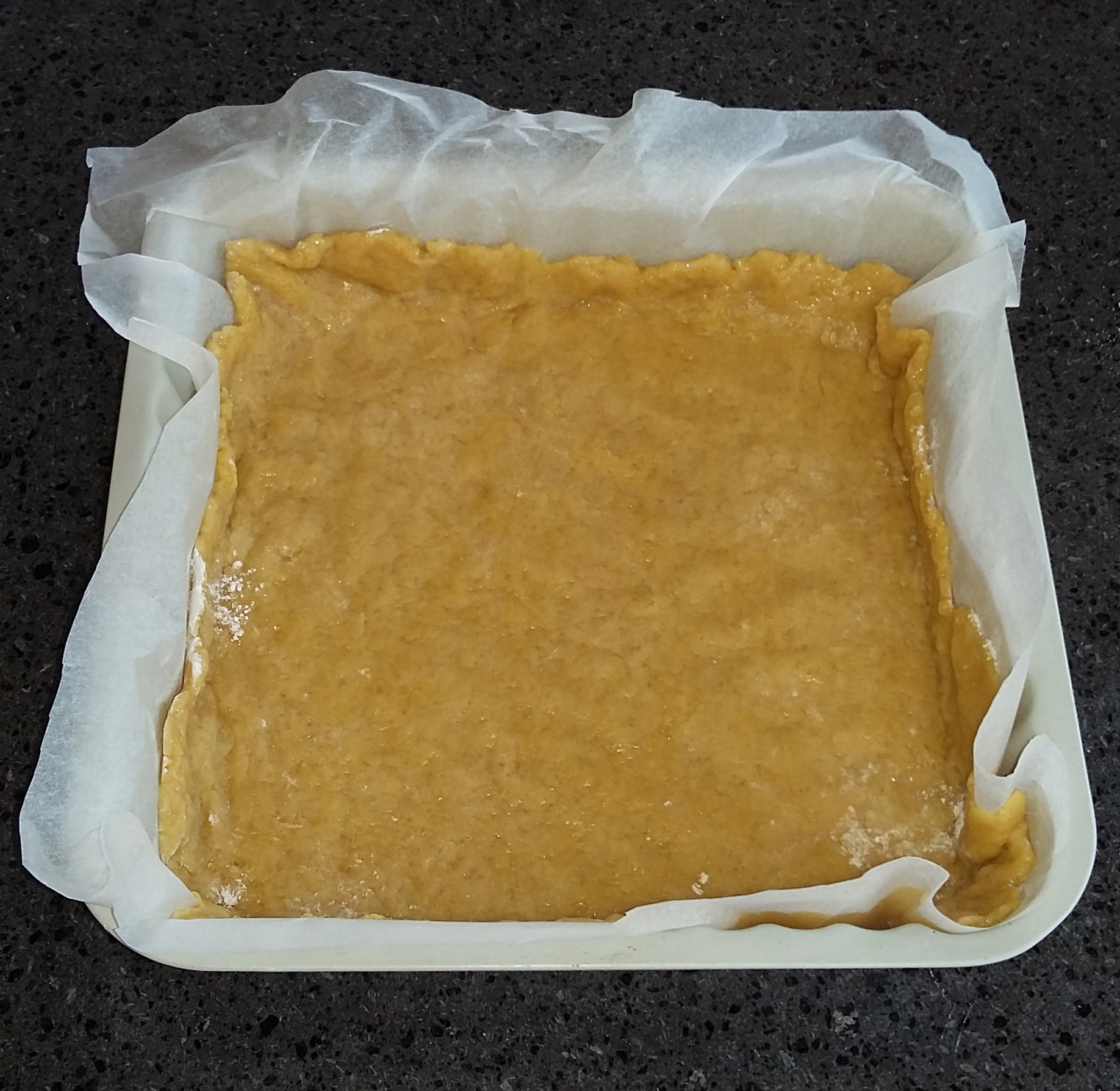 Trascorso questo tempo, stendi l’impasto e mettilo in una teglia quadrata rivestita di carta forno.