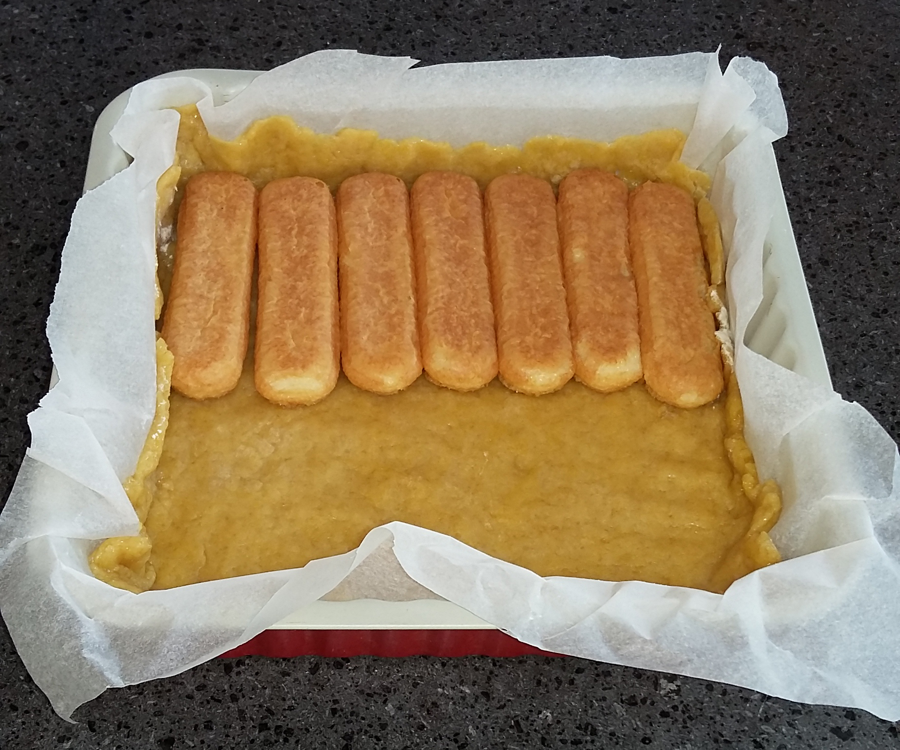 Per comporre la torta: Immergi i savoiardi nel succo d’arancia e mettili sopra alla frolla.