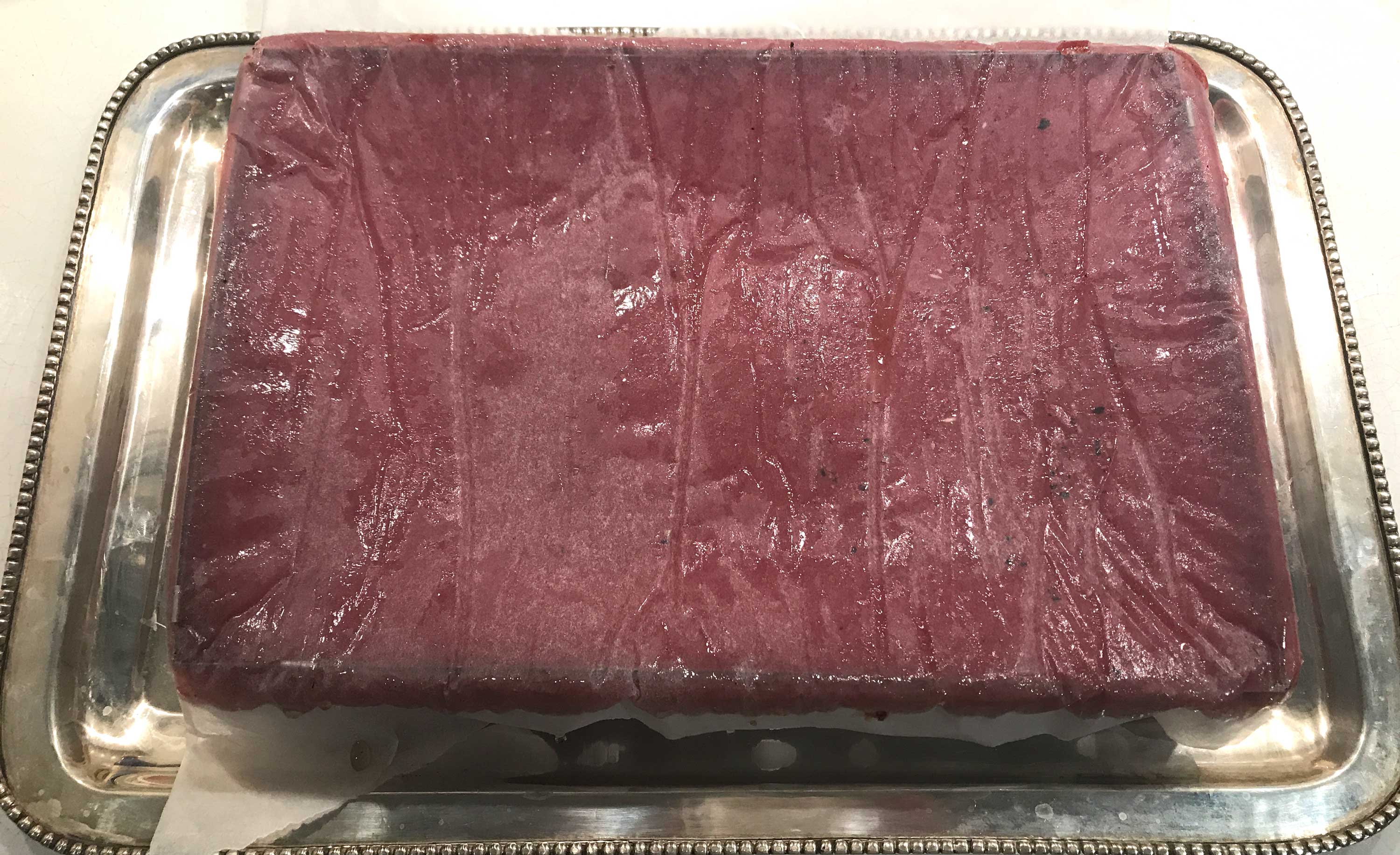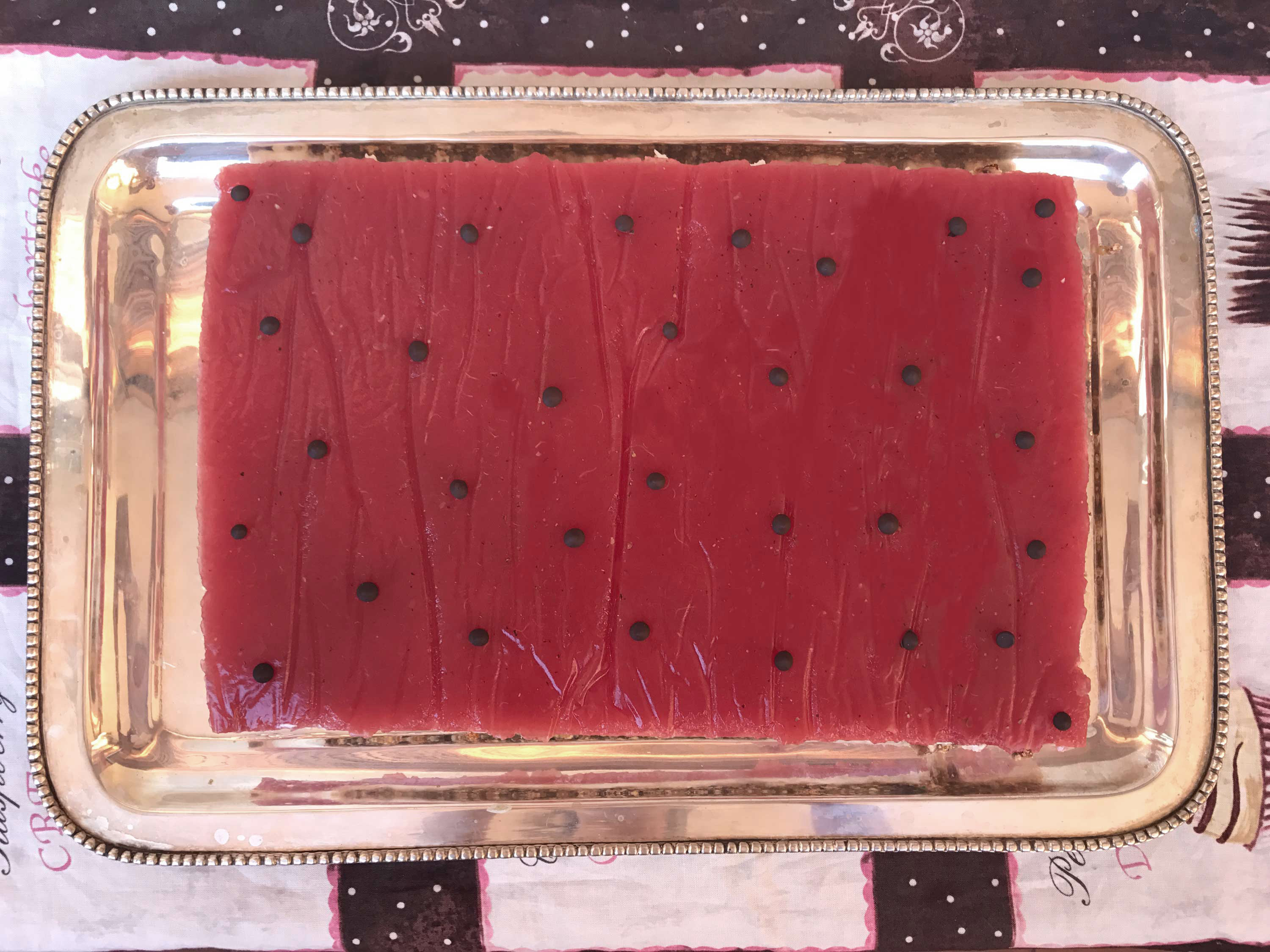Prendi un anello rettangolare per dolci e adagialo all’interno di una teglia delle stesse dimensioni (o leggermente più grande) rivestita di carta forno. Sarebbe opportuno che la teglia sia della stessa dimensione dell’anello perché il succo di anguria è molto liquido e fuoriesce dall’anello, quindi se la teglia che contiene l’anello è troppo grande ti ritroveresti un bordo di anguria gelificata non esteticamente carino.