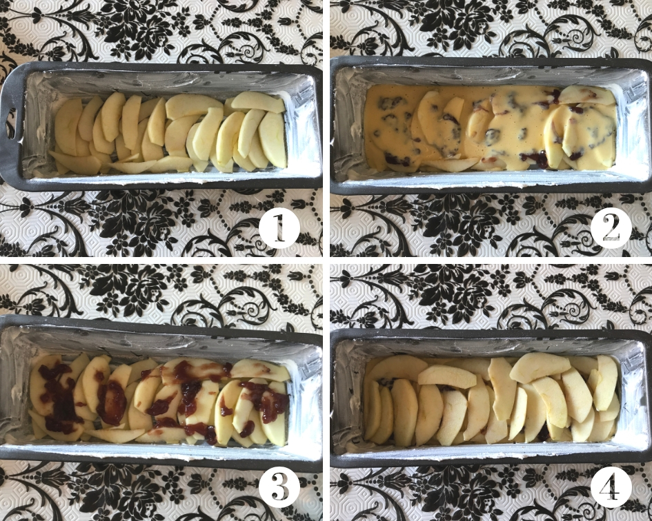 Imburra e infarina una teglia da plumcake. Adagia sul fondo un pò di mele creando uno strato, aggiungi su di esse qualche cucchiaino di marmellata e poi versa una parte del composto. Ripeti questa operazione finché non finiscono le mele e il composto.